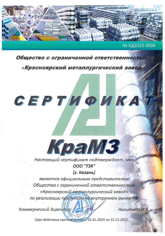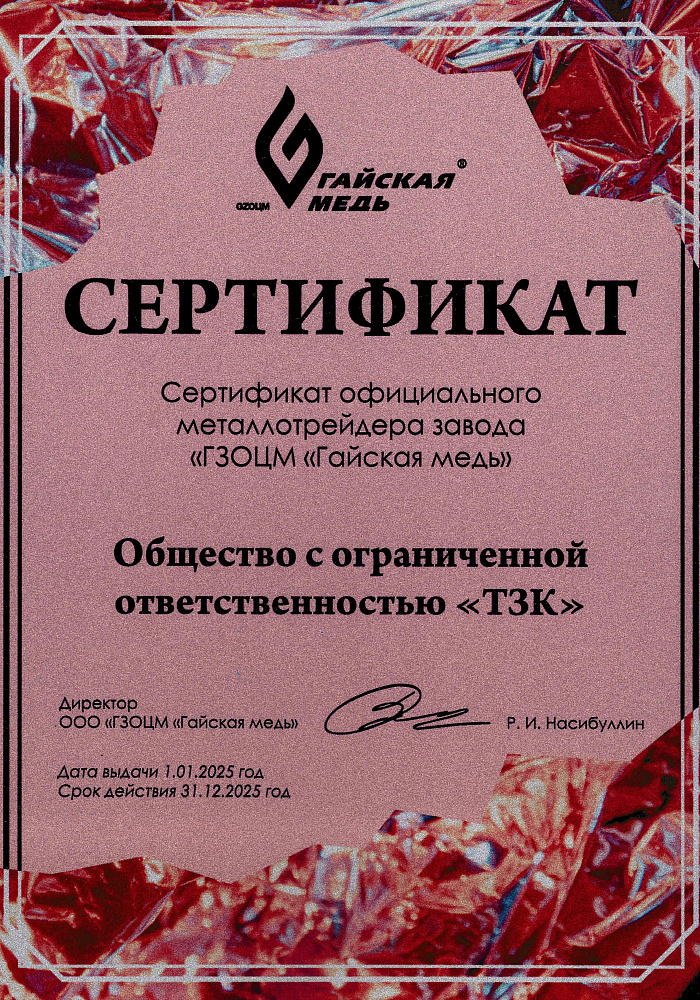 Сертификат официального металлотрейдера завода «Гайская медь»